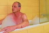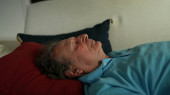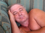 uśmiechnięty śpiący dorosły mężczyzna na kanapie zbliżenie