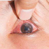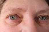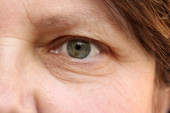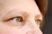 zbliżenie części twarzy kobiety w średnim wieku w wieku 50-55 lat, siniaki na oku, pęknięte naczynie krwionośne, koncepcja nadzoru, podglądanie, śledzenie, badanie wzroku, zabiegi medyczne