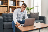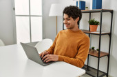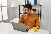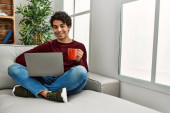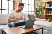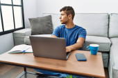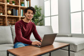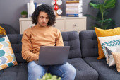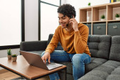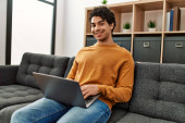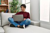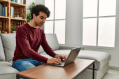 Zdjęcie "Młody Hiszpan korzystający z laptopa siedzącego na kanapie w domu." może być wykorzystywane do celów osobistych i komercyjnych zgodnie z warunkami zakupionej licencji Royalty-free. Obraz jest dostępny do pobrania w jakości wysokiej rozdzielczości do 5760x3840.