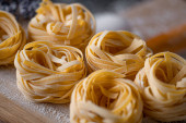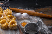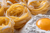 Zdjęcie "Domowej roboty makaron fettuccine złożone w kształcie gniazda. Domowe gotowanie ze składników domowej roboty tradycyjny włoski fettuccine makaron." może być wykorzystywane do celów osobistych i komercyjnych zgodnie z warunkami zakupionej licencji Royalty-free. Obraz jest dostępny do pobrania w jakości wysokiej rozdzielczości do 5760x3840.