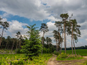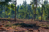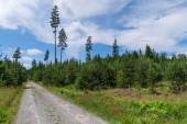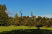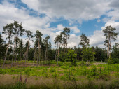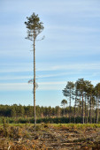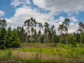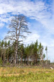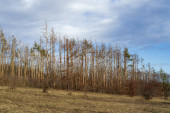 Las iglasty, w którym suche drzewa porośnięte są korą chrząszczy. Niebo jest niebieskie..