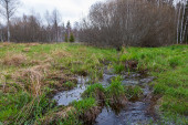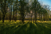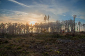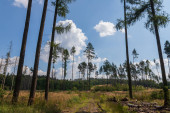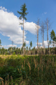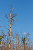 Las iglasty, w którym suche drzewa porośnięte są korą chrząszczy. Niebo jest niebieskie..