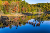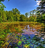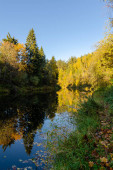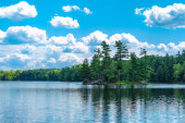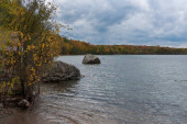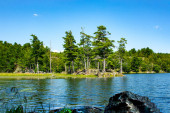 Rodzina bobrów zbudowała dom ze starych gałęzi na leśnym jeziorze.