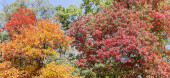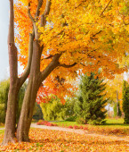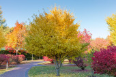 Jesienny park z różnymi drzewami liściastymi i iglastymi oraz krzewami