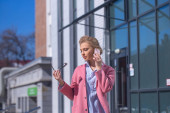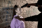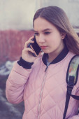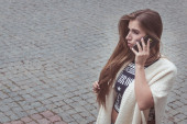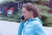 Kobieta rozmawiająca przez telefon, nie podejrzewa, że śledzi ją przestępczy bandyta