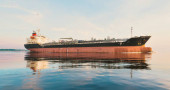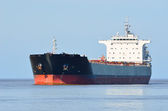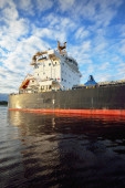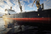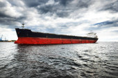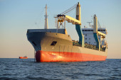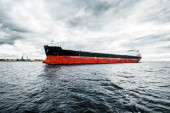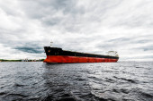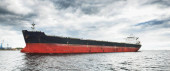 Duży statek towarowy (masowiec) zakotwiczony w porcie o zachodzie słońca, zbliżenie. Dźwigi w tle. Ryga, Morze Bałtyckie, Łotwa Transport towarowy, globalna komunikacja, logistyka, szkody dla środowiska