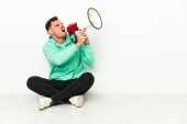 Biznes kaukaski człowiek odizolowany na niebieskim tle krzyczy przez megafon