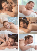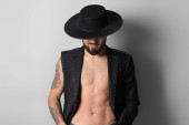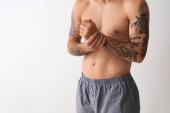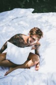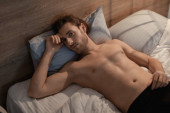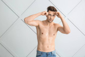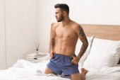 sexy młody mężczyzna zdjąć jego dżinsy w sypialnia
