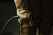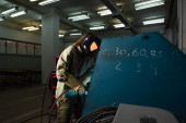 Młody spawacz w rękawiczkach z maską spawalniczą w fabryce