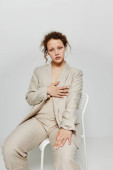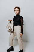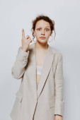 radosna kobieta w garniturze gesty z rękami Styl życia niezmieniony