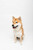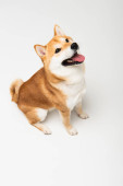 shiba inu pies patrząc w aparat i wystający język na jasnoszarym tle