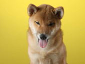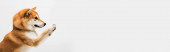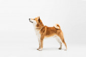 zbliżenie widok shiba inu pies z otwartymi ustami wystające język izolowany na jasnoszary