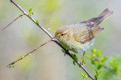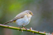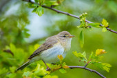Zbliżenie Willow Warbler ptak, Phylloscopus trochilus, śpiew w piękny letni wieczór z miękkim podświetleniem na zielonym, żywym tle.