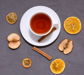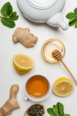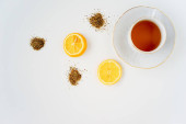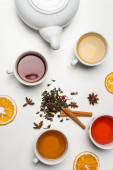Widok z góry filiżanek herbaty w pobliżu mięty, przypraw i suchych plasterków pomarańczy na białym tle