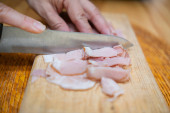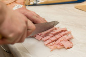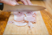 Zdjęcie "Kobieta kroi kiełbasę, szynkę na desce.." może być wykorzystywane do celów osobistych i komercyjnych zgodnie z warunkami zakupionej licencji Royalty-free. Obraz jest dostępny do pobrania w jakości wysokiej rozdzielczości do 5760x3840.