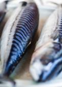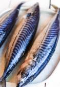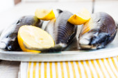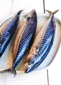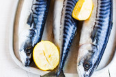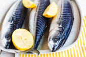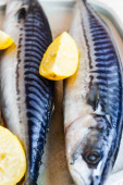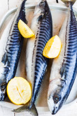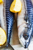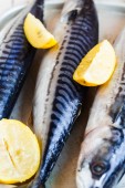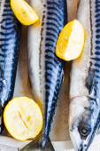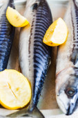 deska surowa ryba makrela z cytryny na metalu, pionowo