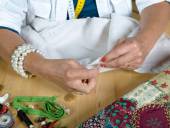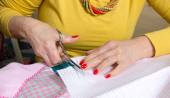 Bliska kobiecej ręki do szycia patchworku