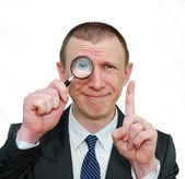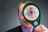 biznesmen szczęśliwy uśmiechający się przez szkło powiększające