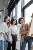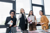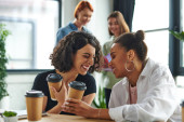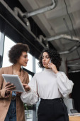 Wesoły międzyrasowy businesswoman rozmowy blisko zamazane pokładzie w biurze