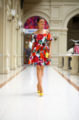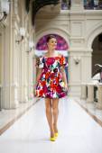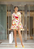 piękna kobieta w czerwone kwiaty sukienka w sklepie