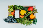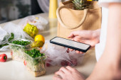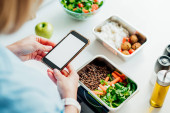 Zdrowy plan odchudzania, codzienne menu gotowego posiłku. Kobieta korzystająca z aplikacji śledzącej posiłki na telefon podczas ważenia pudełka na lunch gotowane z góry w skali kuchennej. Zbalansowana porcja z daniem. Gotowanie wstępne