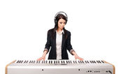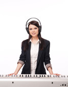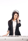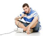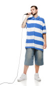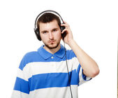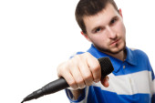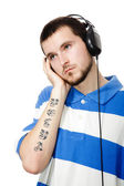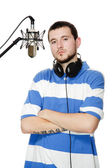 młody facet z brodą, pisze piosenki z słuchawki i micr