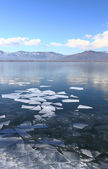 snowy gór na zamarzniętym jeziorze laberge, yukon, Kanada