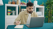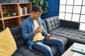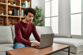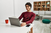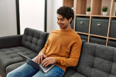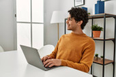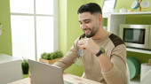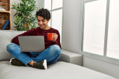 Zdjęcie "Młody Hiszpan korzystający z laptopa i pijący kawę w domu." może być wykorzystywane do celów osobistych i komercyjnych zgodnie z warunkami zakupionej licencji Royalty-free. Obraz jest dostępny do pobrania w jakości wysokiej rozdzielczości do 5760x3840.