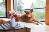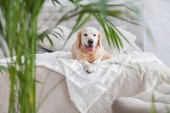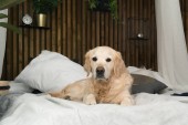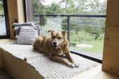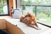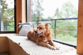 Smutny znudzony pies golden retriever leżący na ręcznie robionym wełnianym dywanie i poduszkach w pobliżu okna panoramicznego w skandynawskim drewnianym hotelu kabinowym lub domu. Deszczowa pogoda w górach lasu. Koncepcja hygge.