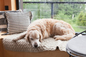 Zdjęcie "Smutny znudzony pies golden retriever leżący na ręcznie robionym wełnianym dywanie i poduszkach w pobliżu okna panoramicznego w skandynawskim drewnianym hotelu kabinowym lub domu. Deszczowa pogoda w górach lasu. Koncepcja hygge." może być wykorzystywane do celów osobistych i komercyjnych zgodnie z warunkami zakupionej licencji Royalty-free. Obraz jest dostępny do pobrania w jakości wysokiej rozdzielczości do 5760x3840.
