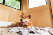 Szczęśliwy czerwony adoptować psa leżącego na ręcznie robionej wełnianej wykładziny i poduszki w pobliżu okna panoramicznego w skandynawskim drewnianym hotelu kabiny lub domu. Deszczowa pogoda w górach lasu. Koncepcja opieki nad zwierzętami Hygge.