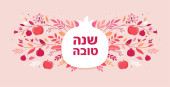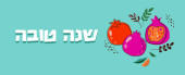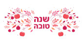 Wzór Rosz Haszana z ręcznie rysowane jabłko, granat, miód i róg Shofar. Litery Shana Tova. Ilustracja wektora. Tłumaczenie z hebrajskiego - Szczęśliwego i słodkiego Nowego Roku
