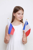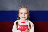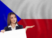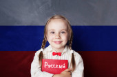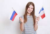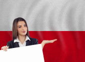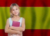 Piękny uśmiech nastolatka dziewczyna z książki na tle flagi Polski