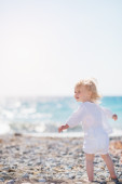 Uśmiechnięte dziecko dziewczynka zawijaæ w ręcznik siedzący na plaży
