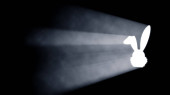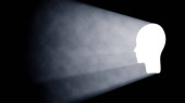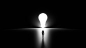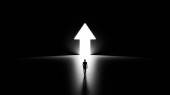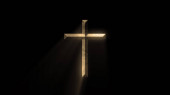 3D Silhouette of a Man Walking into Religious Cross Shaped Hole in the Wall Shinning Light Towards Him, Black Background.