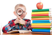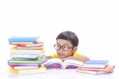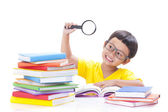 Ładny mały chłopiec czyta książkę podczas noszenia okularów.