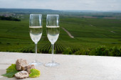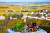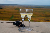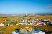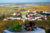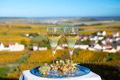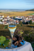 Degustacja francuskiego musującego białego wina z szampanem bąbelki na tarasie z widokiem na kolorowe Grand Cru Szampan winnice w miejscowości Cramant w październiku, w pobliżu Epernay, Francja