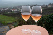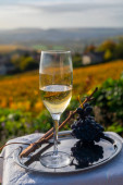 Zdjęcie "Degustacja francuskiego musującego białego wina z szampanem bąbelki na tarasie z widokiem na kolorowe Grand Cru Szampan winnice w miejscowości Cramant w październiku, w pobliżu Epernay, Francja" może być wykorzystywane do celów osobistych i komercyjnych zgodnie z warunkami zakupionej licencji Royalty-free. Obraz jest dostępny do pobrania w jakości wysokiej rozdzielczości do 5760x3840.
