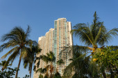 Drzewa z przodu budynków kondominium pod rząd na tle jasnego nieba w Miami, FL. Wiersz wielopiętrowych budynków mieszkalnych z balkonami i nowoczesną architekturą zewnętrzną.
