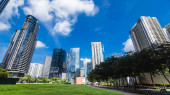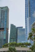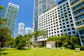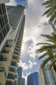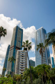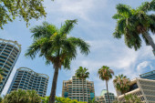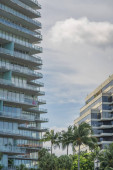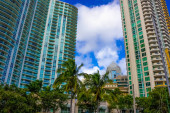 Słońce za wieżowcami z krzakami i drzewami w pobliżu promenady w Miami, FL. Z przodu znajduje się pokład z metalowymi poręczami i kamiennymi płytkami podłogowymi.