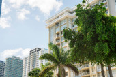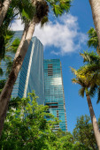 Zdjęcie "Słońce za wieżowcami z krzakami i drzewami w pobliżu promenady w Miami, FL. Z przodu znajduje się pokład z metalowymi poręczami i kamiennymi płytkami podłogowymi." może być wykorzystywane do celów osobistych i komercyjnych zgodnie z warunkami zakupionej licencji Royalty-free. Obraz jest dostępny do pobrania w jakości wysokiej rozdzielczości do 5760x3840.