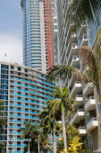 Dwa nowoczesne budynki z pastelowym tle nieba w Miami na Florydzie. Po lewej stronie znajduje się wieżowiec ze szklanymi balustradami na balkonach po drugiej stronie budynku po prawej stronie z odblaskowym szkłem..