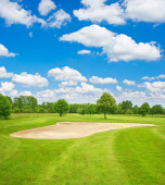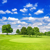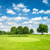 pole golfowe i błękitne niebo pochmurne. piękny krajobraz z zielonej g