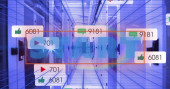 Obraz statystyk i przetwarzania danych nad człowiekiem przy użyciu komputera i ulicy miejskiej. Globalny rynek finansów przedsiębiorstw i koncepcja technologii generowana cyfrowo.