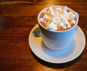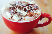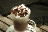 Kubek z gorącą polewą czekoladową z bitej śmietany i kakao aktyw