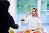 Muslim family having Iftar dinner drinking water to break feast. Eating traditional food during Ramadan feasting month at home. The Islamic Halal Eating and Drinking in modern home.