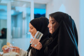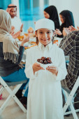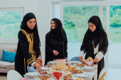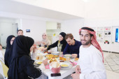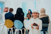 Zdjęcie "Muslim family having Iftar dinner drinking water to break feast. Eating traditional food during Ramadan feasting month at home. The Islamic Halal Eating and Drinking in modern home." może być wykorzystywane do celów osobistych i komercyjnych zgodnie z warunkami zakupionej licencji Royalty-free. Obraz jest dostępny do pobrania w jakości wysokiej rozdzielczości do 5760x3840.