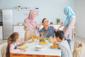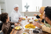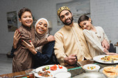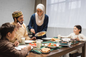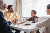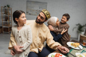 Smiling african american woman in hijab hugging son near family during suhur breakfast in morning