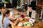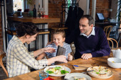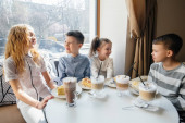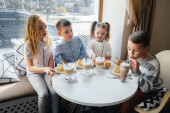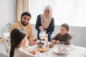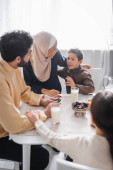 Positive muslim kids sitting near food and blurred father during ramadan at home