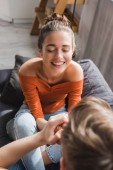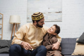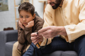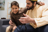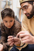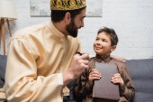 Smiling muslim boy giving turkish tea glass to blurred dad during iftar at home